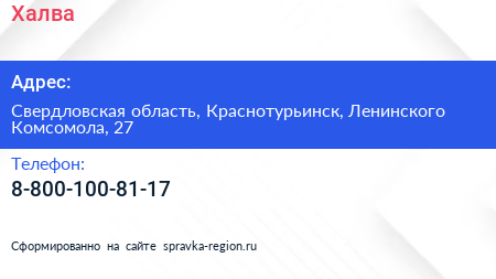 Халва по адресу Свердловская область, Краснотурьинск, Ленинского Комсомола, 27 в дальнейшем Организация, размещена в следующих категориях: