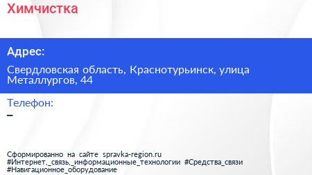 Химчистка по адресу Свердловская область, Краснотурьинск, улица Металлургов, 44 в дальнейшем Организация, размещена в следующих категориях: