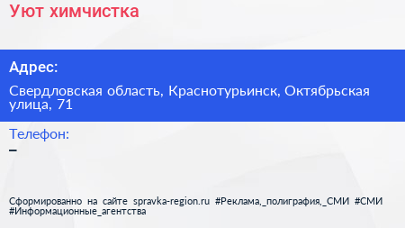 Уют, химчистка по адресу Свердловская область, Краснотурьинск, Октябрьская улица, 71 в дальнейшем Организация, размещена в следующих категориях: