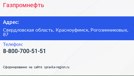 Газпромнефть по адресу Свердловская область, Красноуфимск, Рогозинниковых, 87 в дальнейшем Организация, размещена в следующих категориях: