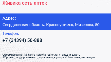 Живика, сеть аптек по адресу Свердловская область, Красноуфимск, Мизерова, 80 в дальнейшем Организация, размещена в следующих категориях: