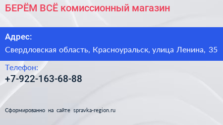 БЕРЁМ ВСЁ!, комиссионный магазин по адресу Свердловская область, Красноуральск, улица Ленина, 35 в дальнейшем Организация, размещена в следующих категориях: