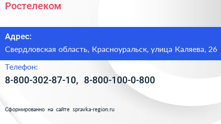 Ростелеком по адресу Свердловская область, Красноуральск, улица Каляева, 26 в дальнейшем Организация, размещена в следующих категориях: