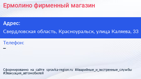 Ермолино, фирменный магазин по адресу Свердловская область, Красноуральск, улица Каляева, 33 в дальнейшем Организация, размещена в следующих категориях: