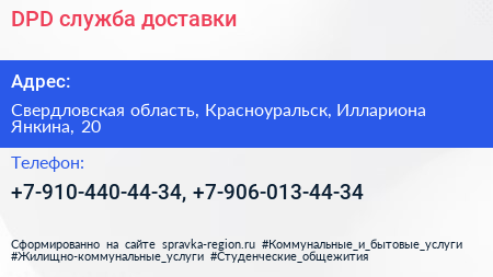 DPD, служба доставки по адресу Свердловская область, Красноуральск, Иллариона Янкина, 20 в дальнейшем Организация, размещена в следующих категориях:
