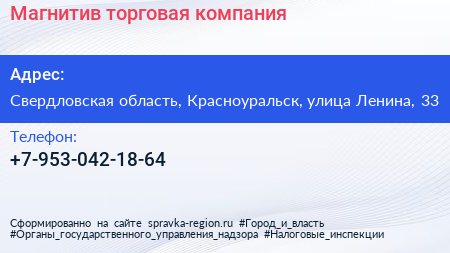 Магнитив, торговая компания по адресу Свердловская область, Красноуральск, улица Ленина, 33 в дальнейшем Организация, размещена в следующих категориях: