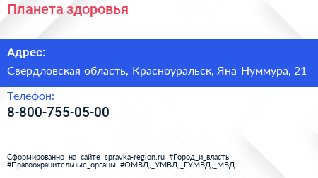 Планета здоровья по адресу Свердловская область, Красноуральск, Яна Нуммура, 21 в дальнейшем Организация, размещена в следующих категориях: