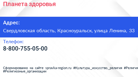 Планета здоровья по адресу Свердловская область, Красноуральск, улица Ленина, 33 в дальнейшем Организация, размещена в следующих категориях: