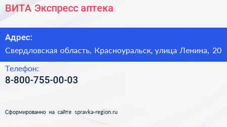ВИТА Экспресс, аптека по адресу Свердловская область, Красноуральск, улица Ленина, 20 в дальнейшем Организация, размещена в следующих категориях: