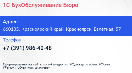 1С: БухОбслуживание Бюро по адресу 660135, Красноярский край, Красноярск, Взлётная, 57 в дальнейшем Организация, размещена в следующих категориях: