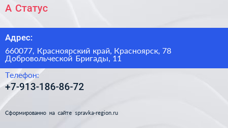 А-Статус по адресу 660077, Красноярский край, Красноярск, 78 Добровольческой Бригады, 11 в дальнейшем Организация, размещена в следующих категориях:
