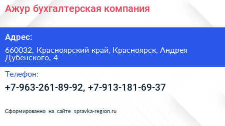 Ажур, бухгалтерская компания по адресу 660032, Красноярский край, Красноярск, Андрея Дубенского, 4 в дальнейшем Организация, размещена в следующих категориях: