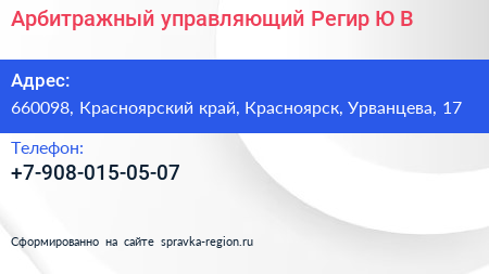 Арбитражный управляющий Регир Ю.В. по адресу 660098, Красноярский край, Красноярск, Урванцева, 17 в дальнейшем Организация, размещена в следующих категориях: