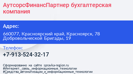 АутсорсФинансПартнер, бухгалтерская компания по адресу 660077, Красноярский край, Красноярск, 78 Добровольческой Бригады, 19 в дальнейшем Организация, размещена в следующих категориях: