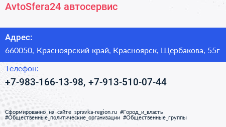 AvtoSfera24, автосервис по адресу 660050, Красноярский край, Красноярск, Щербакова, 55г в дальнейшем Организация, размещена в следующих категориях: