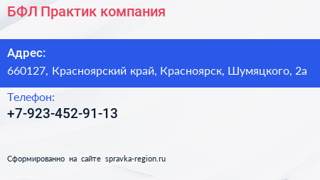 БФЛ-Практик, компания по адресу 660127, Красноярский край, Красноярск, Шумяцкого, 2а в дальнейшем Организация, размещена в следующих категориях: