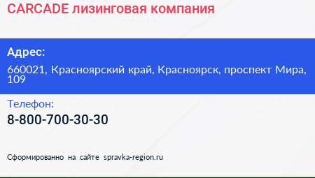 CARCADE, лизинговая компания по адресу 660021, Красноярский край, Красноярск, проспект Мира, 109 в дальнейшем Организация, размещена в следующих категориях: