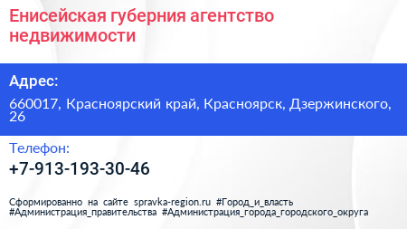 Енисейская губерния, агентство недвижимости по адресу 660017, Красноярский край, Красноярск, Дзержинского, 26 в дальнейшем Организация, размещена в следующих категориях: