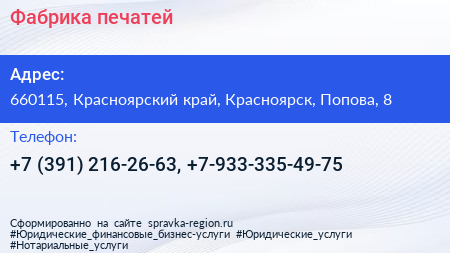 Фабрика печатей по адресу 660115, Красноярский край, Красноярск, Попова, 8 в дальнейшем Организация, размещена в следующих категориях: