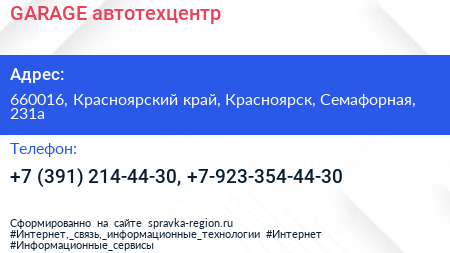 GARAGE, автотехцентр по адресу 660016, Красноярский край, Красноярск, Семафорная, 231а в дальнейшем Организация, размещена в следующих категориях: