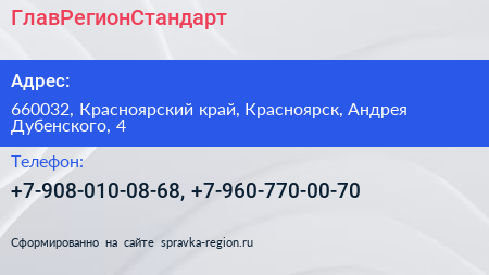 ГлавРегионСтандарт по адресу 660032, Красноярский край, Красноярск, Андрея Дубенского, 4 в дальнейшем Организация, размещена в следующих категориях: