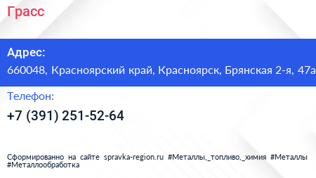 Грасс по адресу 660048, Красноярский край, Красноярск, Брянская 2-я, 47а в дальнейшем Организация, размещена в следующих категориях:
