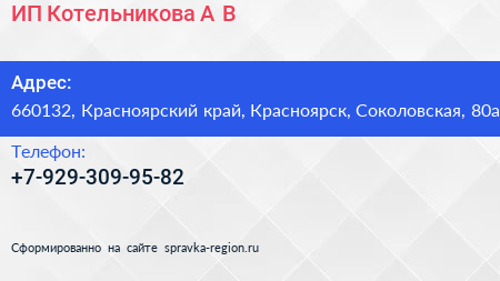 ИП Котельникова А.В. по адресу 660132, Красноярский край, Красноярск, Соколовская, 80а в дальнейшем Организация, размещена в следующих категориях: