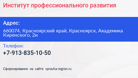 Институт профессионального развития по адресу 660074, Красноярский край, Красноярск, Академика Киренского, 2и в дальнейшем Организация, размещена в следующих категориях: