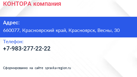 КОНТОРА, компания по адресу 660077, Красноярский край, Красноярск, Весны, 30 в дальнейшем Организация, размещена в следующих категориях: