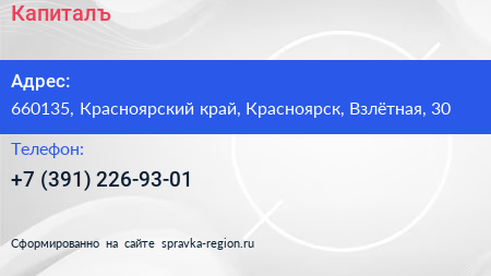 Капиталъ по адресу 660135, Красноярский край, Красноярск, Взлётная, 30 в дальнейшем Организация, размещена в следующих категориях: