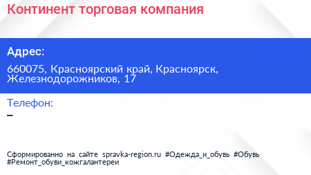 Континент, торговая компания по адресу 660075, Красноярский край, Красноярск, Железнодорожников, 17 в дальнейшем Организация, размещена в следующих категориях: