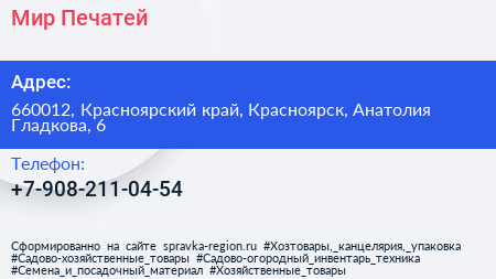 Мир Печатей по адресу 660012, Красноярский край, Красноярск, Анатолия Гладкова, 6 в дальнейшем Организация, размещена в следующих категориях: