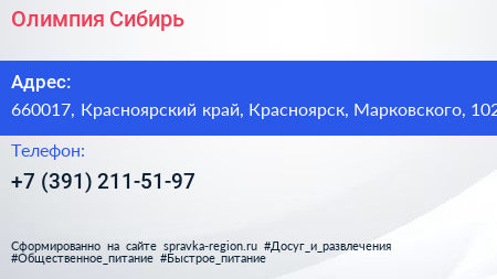 Олимпия-Сибирь по адресу 660017, Красноярский край, Красноярск, Марковского, 102 в дальнейшем Организация, размещена в следующих категориях: