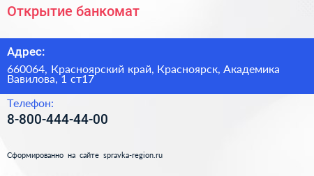 Открытие, банкомат по адресу 660064, Красноярский край, Красноярск, Академика Вавилова, 1 ст17 в дальнейшем Организация, размещена в следующих категориях: