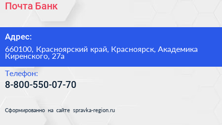 Почта Банк по адресу 660100, Красноярский край, Красноярск, Академика Киренского, 27а в дальнейшем Организация, размещена в следующих категориях: