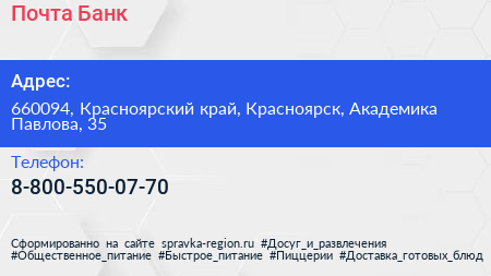 Почта Банк по адресу 660094, Красноярский край, Красноярск, Академика Павлова, 35 в дальнейшем Организация, размещена в следующих категориях: