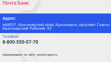 Почта Банк по адресу 660037, Красноярский край, Красноярск, проспект Газеты Красноярский Рабочий, 43 в дальнейшем Организация, размещена в следующих категориях: