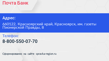 Почта Банк по адресу 660122, Красноярский край, Красноярск, им. газеты Пионерской Правды, 8 в дальнейшем Организация, размещена в следующих категориях: