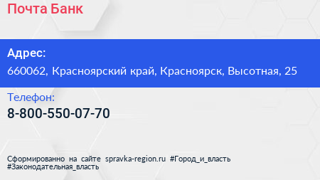 Почта Банк по адресу 660062, Красноярский край, Красноярск, Высотная, 25 в дальнейшем Организация, размещена в следующих категориях: