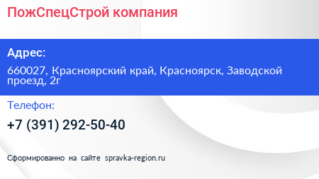 ПожСпецСтрой, компания по адресу 660027, Красноярский край, Красноярск, Заводской проезд, 2г в дальнейшем Организация, размещена в следующих категориях: