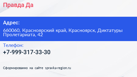 Правда.Да по адресу 660060, Красноярский край, Красноярск, Диктатуры Пролетариата, 42 в дальнейшем Организация, размещена в следующих категориях: