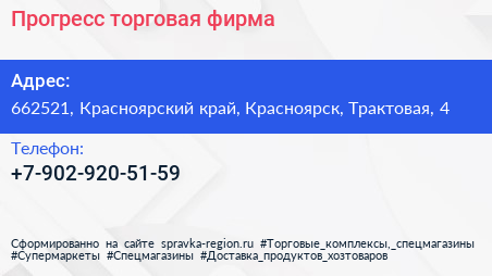 Прогресс, торговая фирма по адресу 662521, Красноярский край, Красноярск, Трактовая, 4 в дальнейшем Организация, размещена в следующих категориях: