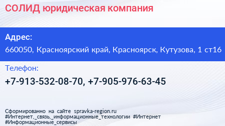 СОЛИД, юридическая компания по адресу 660050, Красноярский край, Красноярск, Кутузова, 1 ст16 в дальнейшем Организация, размещена в следующих категориях: