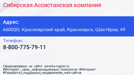Сибирская Асcистанская компания по адресу 660020, Красноярский край, Красноярск, Шахтёров, 49 в дальнейшем Организация, размещена в следующих категориях: