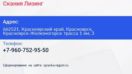 Скания Лизинг по адресу 662521, Красноярский край, Красноярск, Красноярск-Железногорск трасса 1 км, 3 в дальнейшем Организация, размещена в следующих категориях: