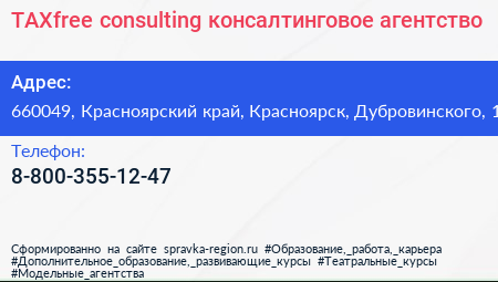 TAXfree consulting, консалтинговое агентство по адресу 660049, Красноярский край, Красноярск, Дубровинского, 1 в дальнейшем Организация, размещена в следующих категориях: