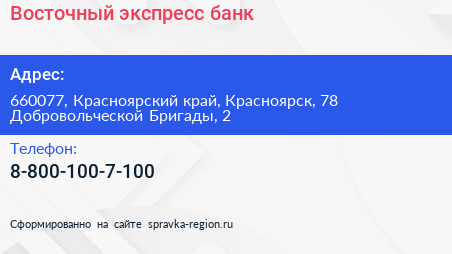 Восточный экспресс банк по адресу 660077, Красноярский край, Красноярск, 78 Добровольческой Бригады, 2 в дальнейшем Организация, размещена в следующих категориях:
