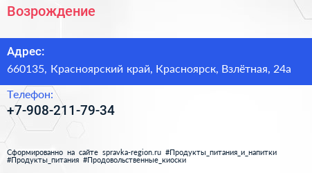Возрождение по адресу 660135, Красноярский край, Красноярск, Взлётная, 24а в дальнейшем Организация, размещена в следующих категориях:
