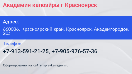 Академия капоэйры, г. Красноярск по адресу 660036, Красноярский край, Красноярск, Академгородок, 20а в дальнейшем Организация, размещена в следующих категориях: