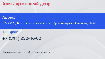 Альтаир, конный двор по адресу 660011, Красноярский край, Красноярск, Лесная, 102г в дальнейшем Организация, размещена в следующих категориях: